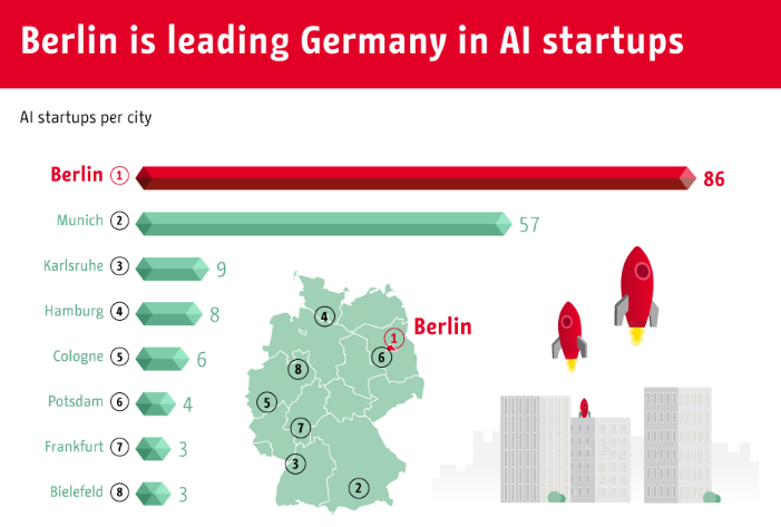 • As seen in the above figure that Munich and Berlin dominates AI app market and together contribute 50% of the AI market.