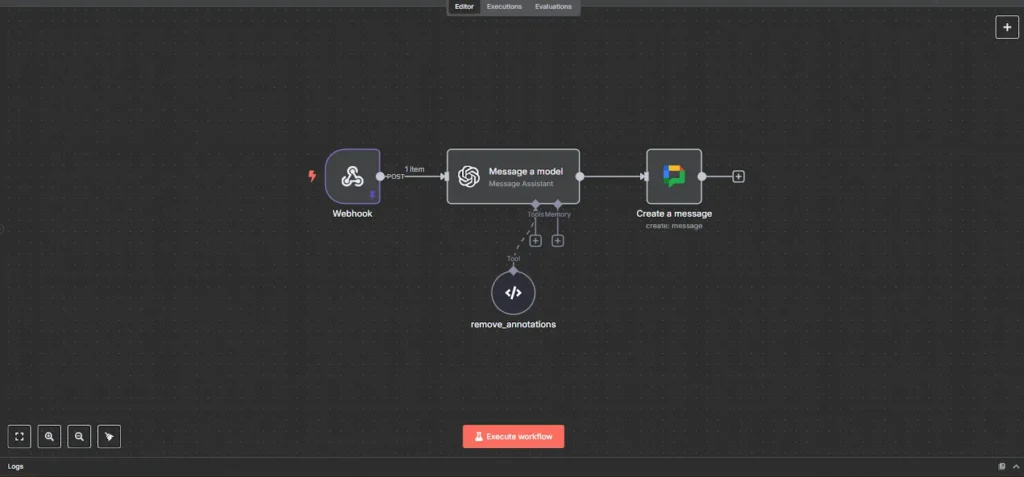 • After the trigger, add action nodes to perform specific tasks. These can be integrations with other apps(e.g. Google sheets, OpenAI, Slack).