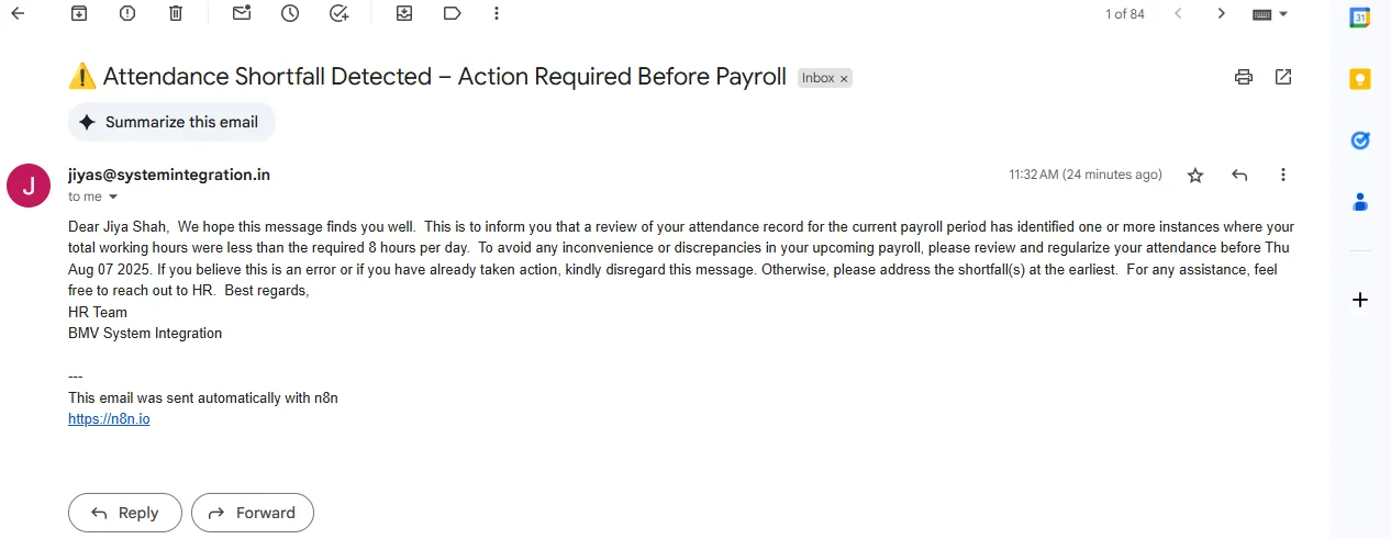 Challenges like attendance shortfalls can be automated with n8n and also it helps in smoothly managing the business workflow. Making sure that HR’s manual workload is less and allowing them to focus on strategic and critical tasks.