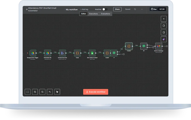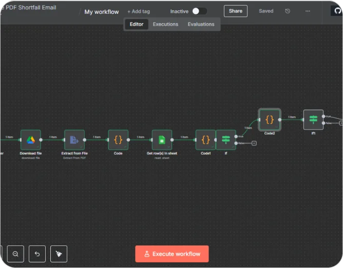 When the document is uploaded, the PDF content is parsed using the ‘Extract from File’ node. And a ‘Code Node’ is used to find the names of any employees mentioned in the text. This strategy helps the system successfully to reconcile between the records of attendance and the employee without needing HR intervention.