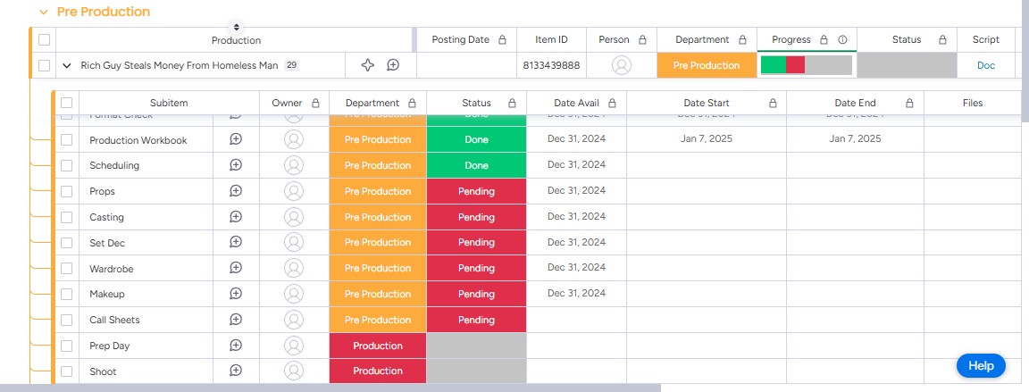Once scripts were broken down, teams at different stages like props, wardrobe, makeup etc. had to manually create tasks in Monday.com. Updates were rarely in sync, meaning nobody had a single source of truth.