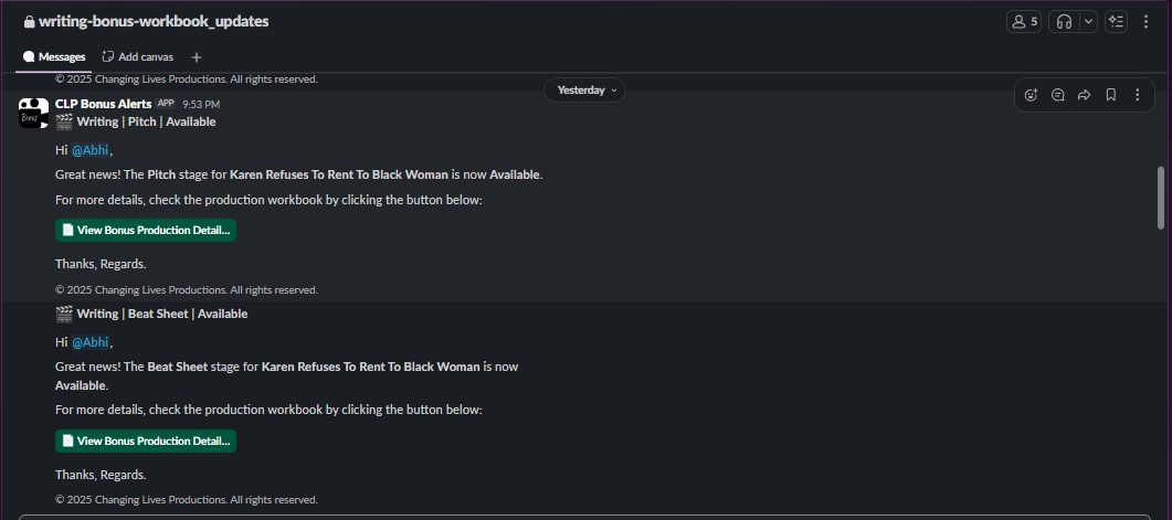 To keep teams in sync without constant email chains, we connected the system directly to Slack. Key updates like a script status change, a new casting assignment, or a call sheet ready for review, were instantly pushed into dedicated Slack channels.