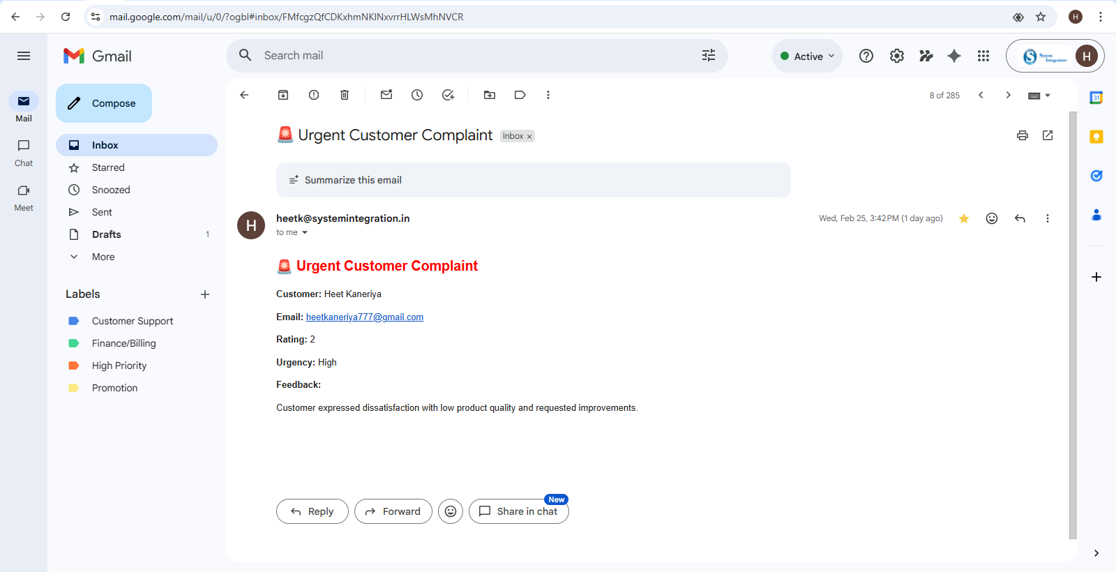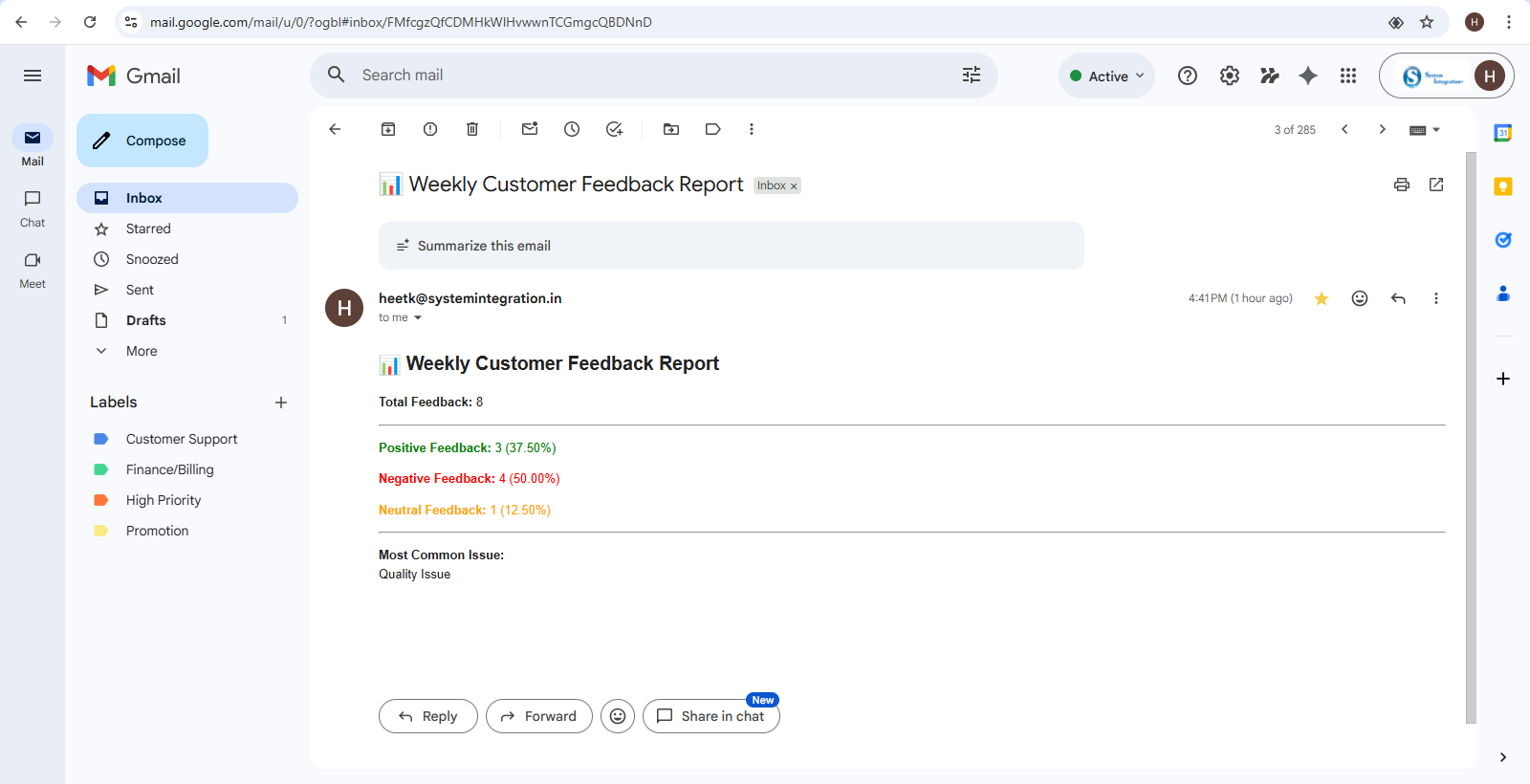 The Customer Feedback Automation System demonstrates how AI and workflow automation can transform reactive customer service into proactive issue management.