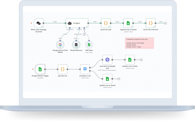 A two-layer AI-Powered chatbot system integrating n8n, google sheets, google gemini AI model and Google chat. The system ensures customer messages are analyzed intelligently, responded to instantly, logged systematically and escalated automatically when needed.