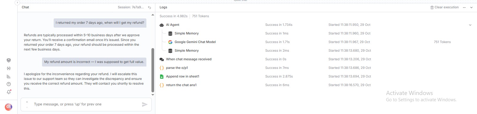 - When a customer submits a message through the website chat interface, the n8n workflow is triggered instantly.