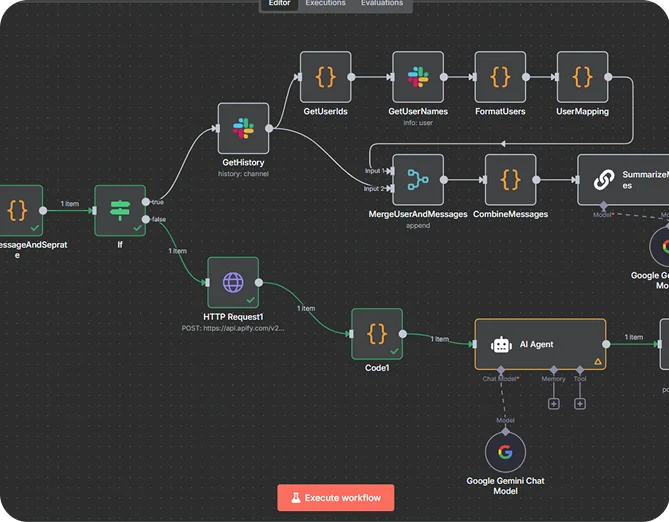 The workflow can invoke some external knowledge: Maybe invoke SEMrush (for marketing type questions) or Apify (for broader web scraping/search automation). This is so the responses are not restricted to what gets discussed in Slack, but are imbued with additional real-world data.