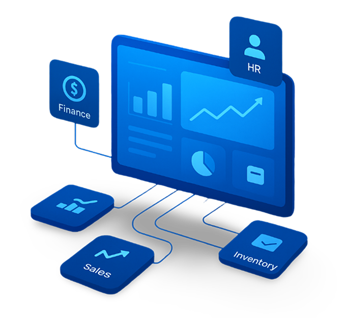 ERP (Enterprise Resource Planning) software is a unified system that manages your core business departments – sales, HR, finance, inventory, production, purchase, supply chain, and more. Instead of using multiple disconnected tools or spreadsheets, ERP brings everything into one centralized platform with automation and real-time data.