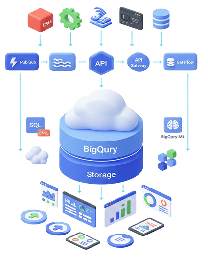 Our certified integration specialists architect implement and manage BigQuery solutions based on business goals, enabling companies to take cost out of their processes, run queries faster produce reports quickly and perform advanced analytics with scalable architecture using established industry best practice.